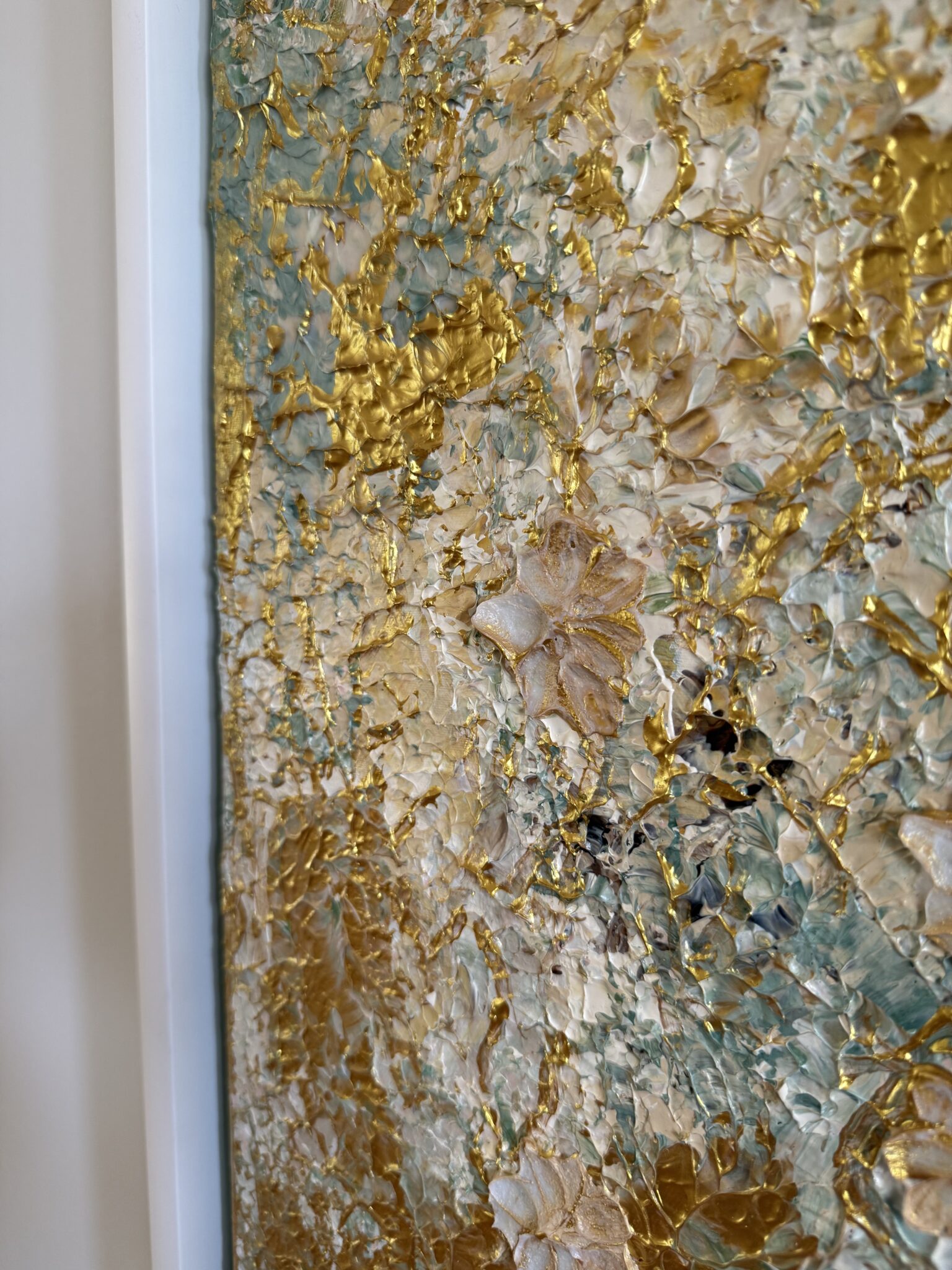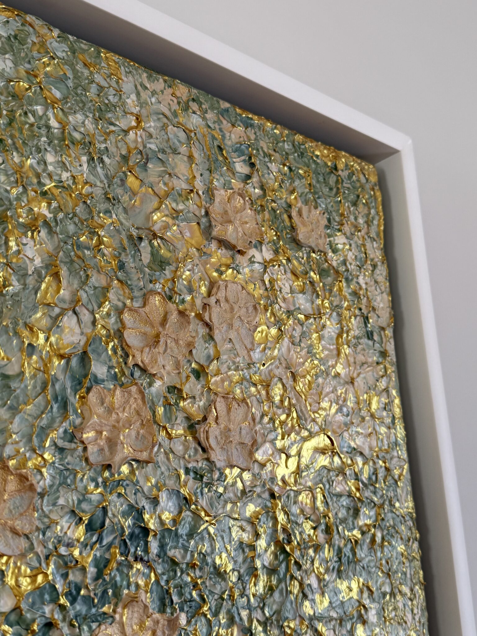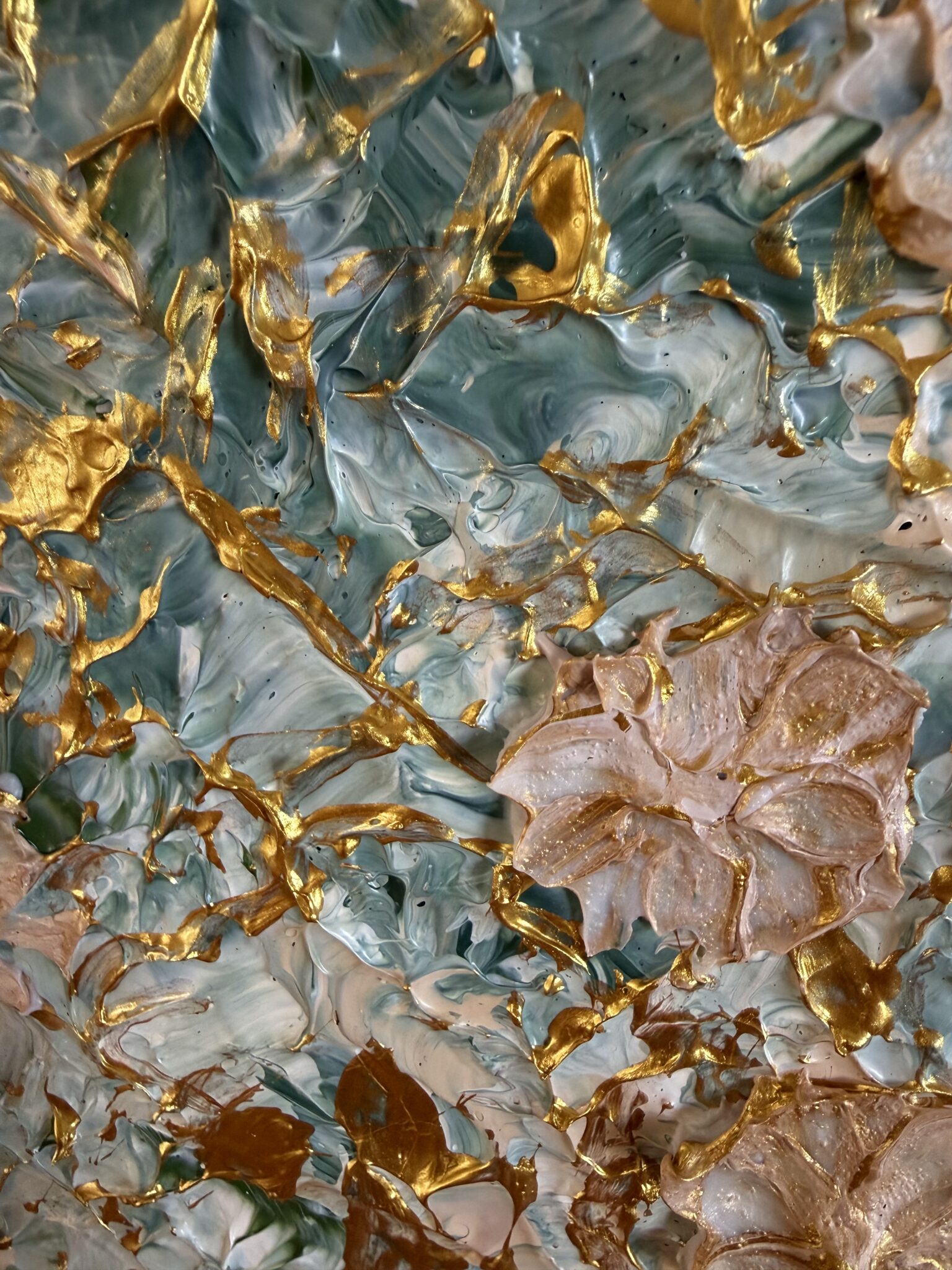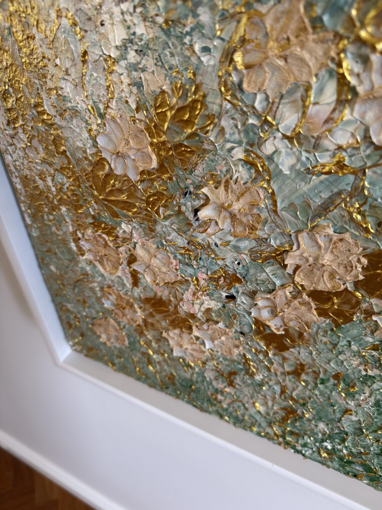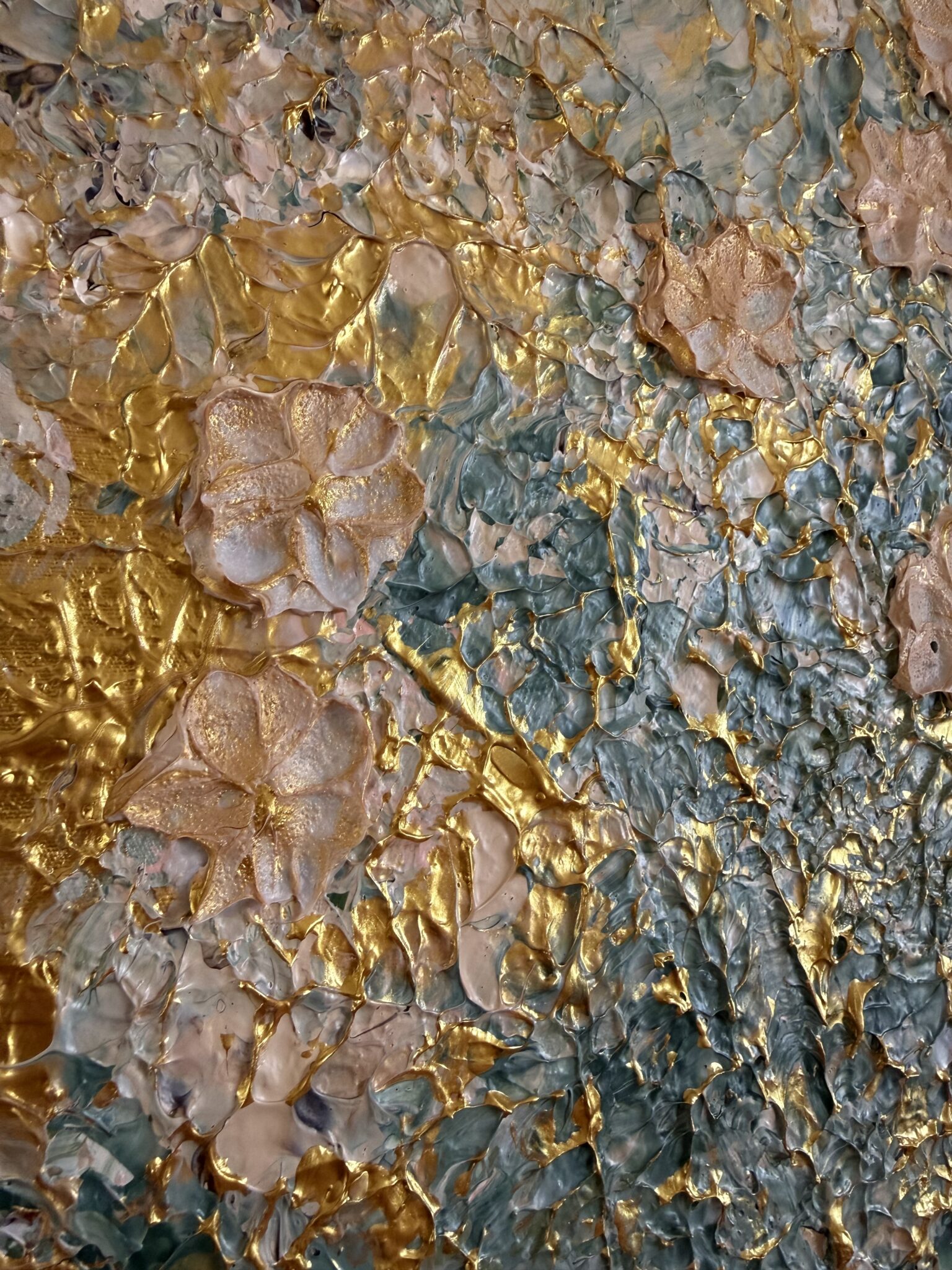 …a garden after a light summer rain: created in many layers…soft structures like leaves covered by rain, catching the light… on top of this, countless glazes of delicate olive green, Venetian pink, rosé and warm gold. The garden changes with each layer. Some colors disappear again under new layers, others shimmer gently through. Only at the very end do the flowers begin to emerge – delicately, almost as if by chance – and yet exactly where the sunlight finds them after a summer rain.